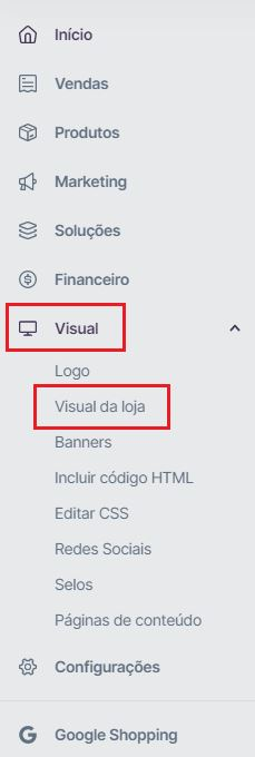 Acesse seu painel da loja virtual, no menu esquerdo, clique em "Visual" e selecione "Visual da loja".